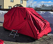 Транспортировочный тент-чехол из синтетической, ветро- и влагонепроницаемой ткани Оксфорд с пропиткой. Материал более плотный и крепкий, чем «таффета», имеет увеличенный срок службы (более 5 лет). Чехол имеет ленты и карабины для надежной фиксации чехла при транспортировке. Его можно использовать как зимой, так и летом, в гараже и на открытом воздухе. Вес изделия около 2,5 кг, габариты в сложенном состоянии 40х20х20 см. Чехол возможен в исполнении двух видов тканей плотностью 240 и 600 den.